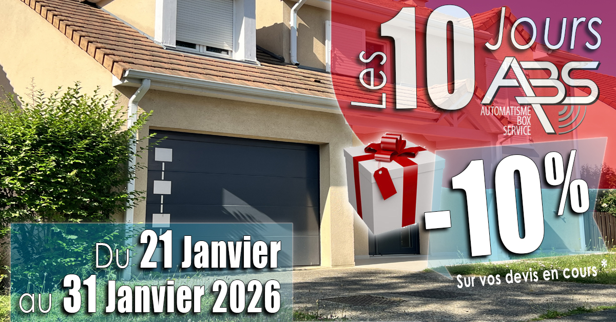 * Offre non cumulable avec d'autres opérations promotionnelles ou remises spécifiques, valable du 21 Janvier au 31 Janvier 2026 inclus pour toute commande avec installation en Île-de-France de devis en cours, hors intervention, hors devis SAV ou contrat de maintenance et hors portes de parking et portails à usage collectif et hors acheminement par monte-meuble. La remise s'applique sur le prix TTC. La société ABS se réserve le droit de modifier cette offre sans préavis, suivant la loi en vigueur.